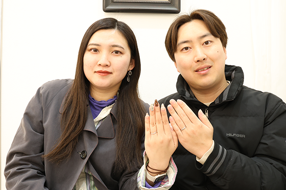 女性用は細く可愛らしい雰囲気で、彼の男性用は太く、艶消しのラインも入りシックな雰囲気で、お互いの好みに沿ったデザインでした。