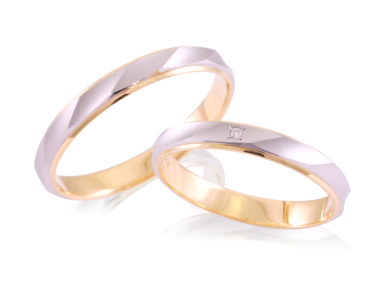 プラチナと18金ゴールドが織りなすマット調の上品なデザイン。レディースには1石のダイヤモンドが優美な輝きを添える指輪。