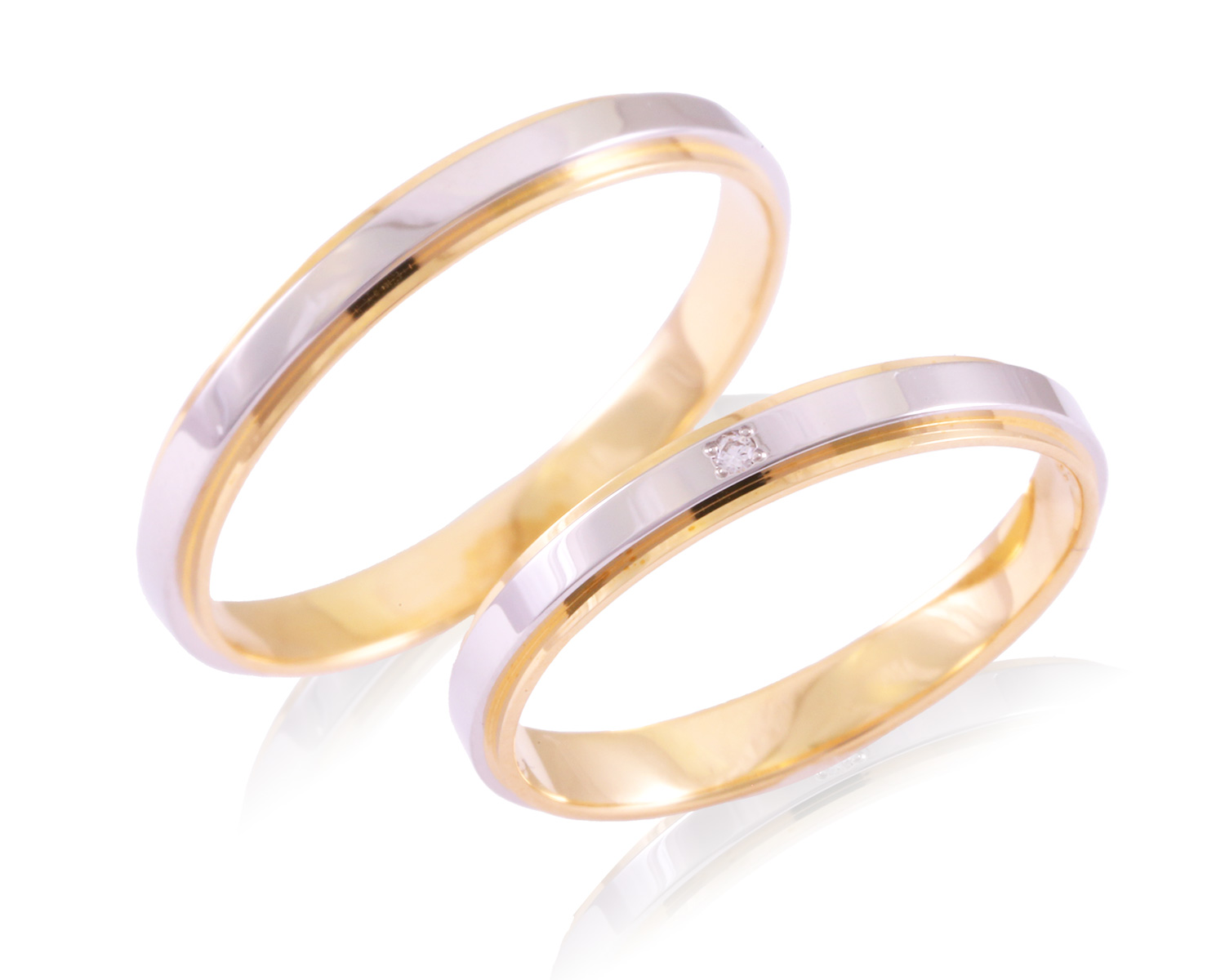 プラチナと18金ゴールドの絶妙な輝き。ポリッシュ仕様で光り輝くデザイン。1石のダイヤが少し角張った独創的な指輪を彩ります。
