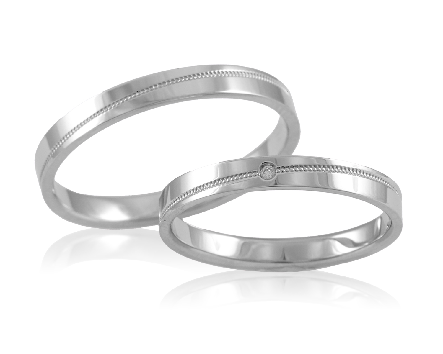 プラチナ一色の角張ったストレートライン。斜めに一周のミル打ちが独自の輝きを放ち、レディースには1石のダイヤモンドが優雅に輝く指輪。