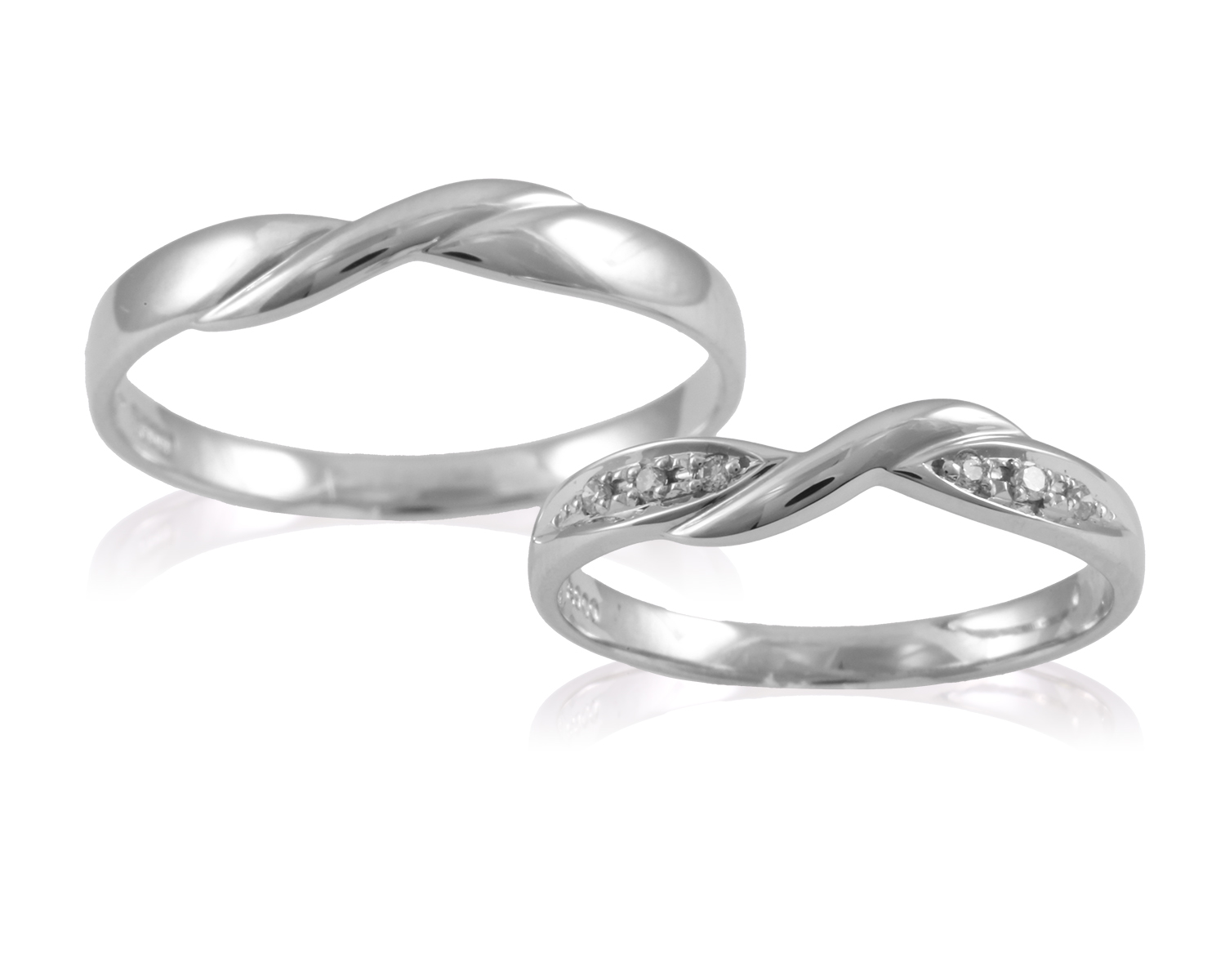個性的な捻りの入ったデザイン。レディースには対称的に3石ずつ計6石のダイヤモンドが輝き、個性的な指輪が愛を象徴します