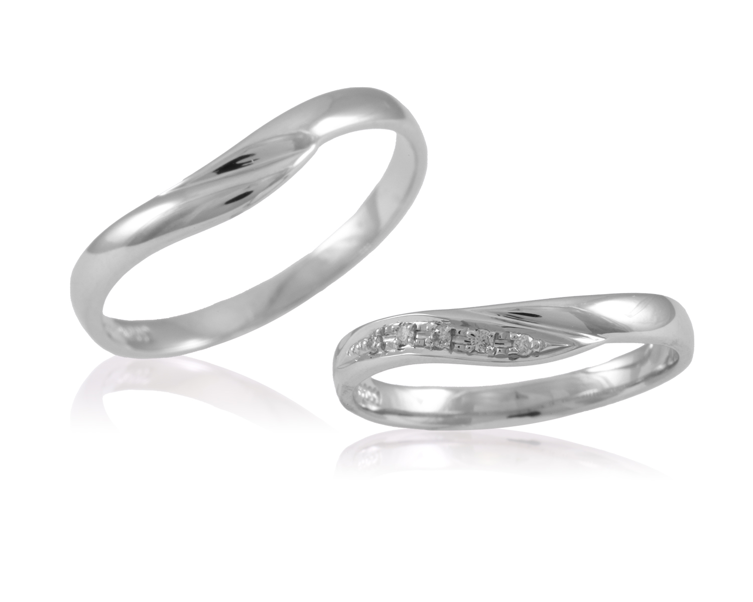 優しく交わるVライン、広めの優雅なデザイン。レディースには5つのダイヤが柔らかな輝きを添え、愛を包み込む指輪