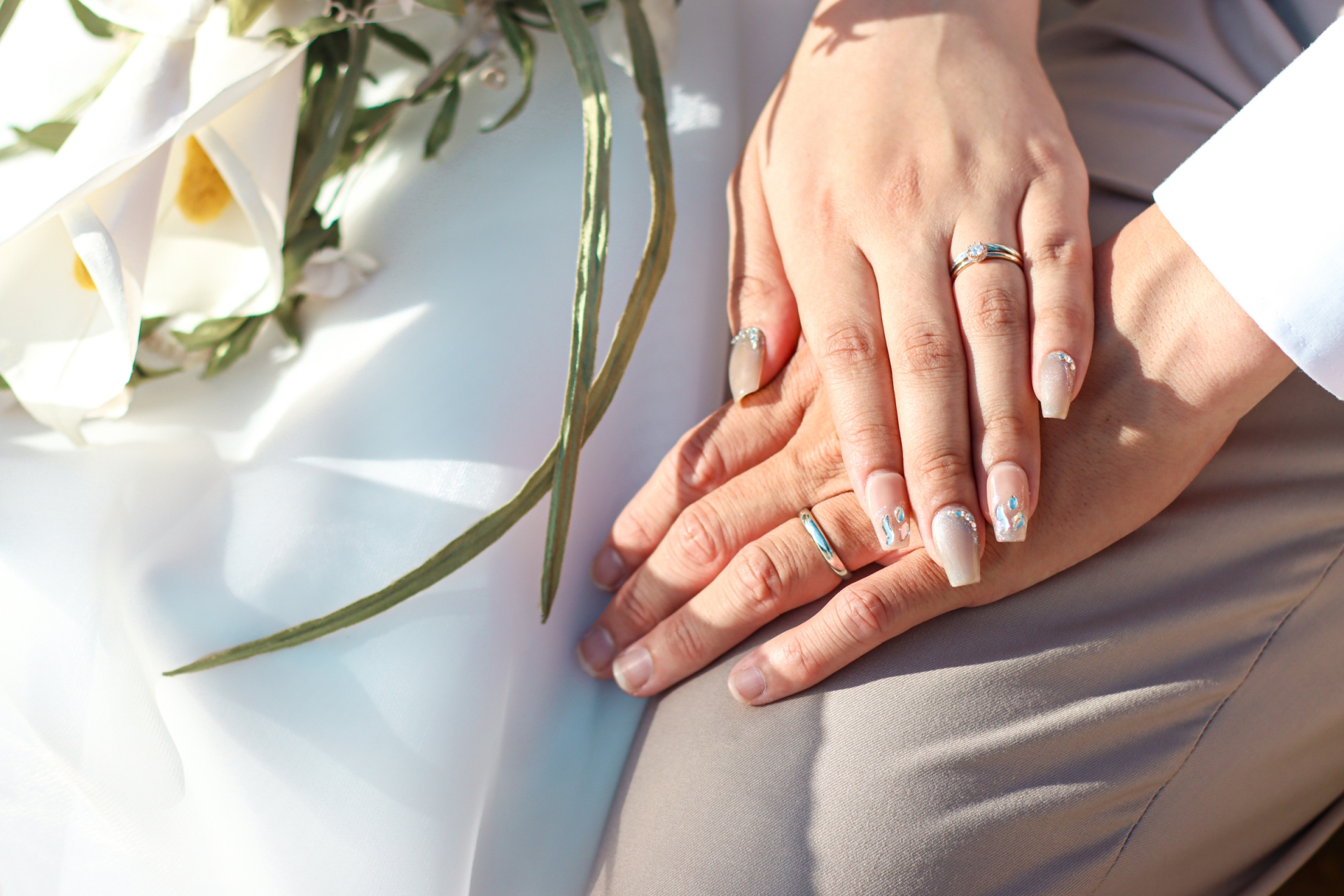 女性らしい鋭いVラインには5石の輝き。メンズは広めの幅で一部がマットな艶消し仕上げ、シックな雰囲気漂う愛の証
